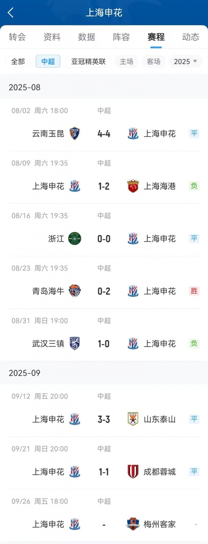 從8月以來,申花7場中超僅有一場勝利(客場2-0海牛),其余6場比賽均不勝,取得4平2負(fù)。